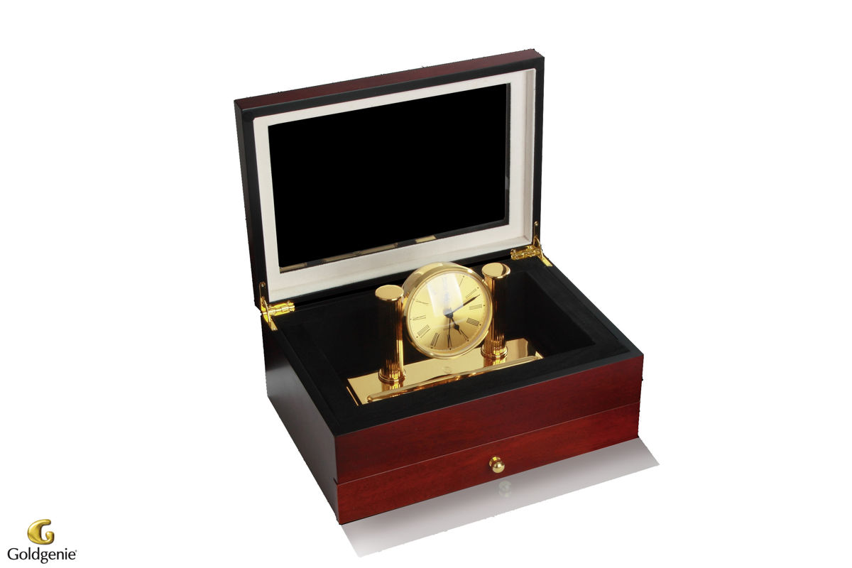 This regal 24K gold-plated clock forges traditional craftsmanship with classic design and makes for a useful timeless ornament on any desktop.