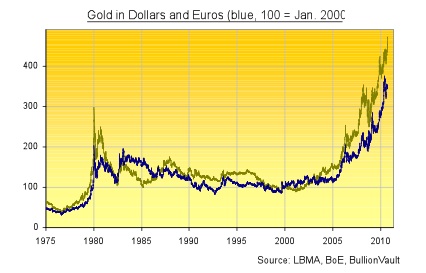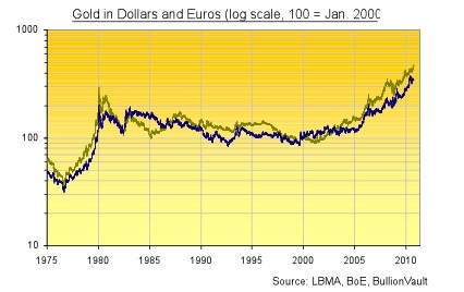 Gold’s ascent in the Dollar clearly began earlier than it did in the Euro. But the bull market in gold (or bear market in money, depending on how you see it) has been much steadier against both than the present “frenzy” might suggest.