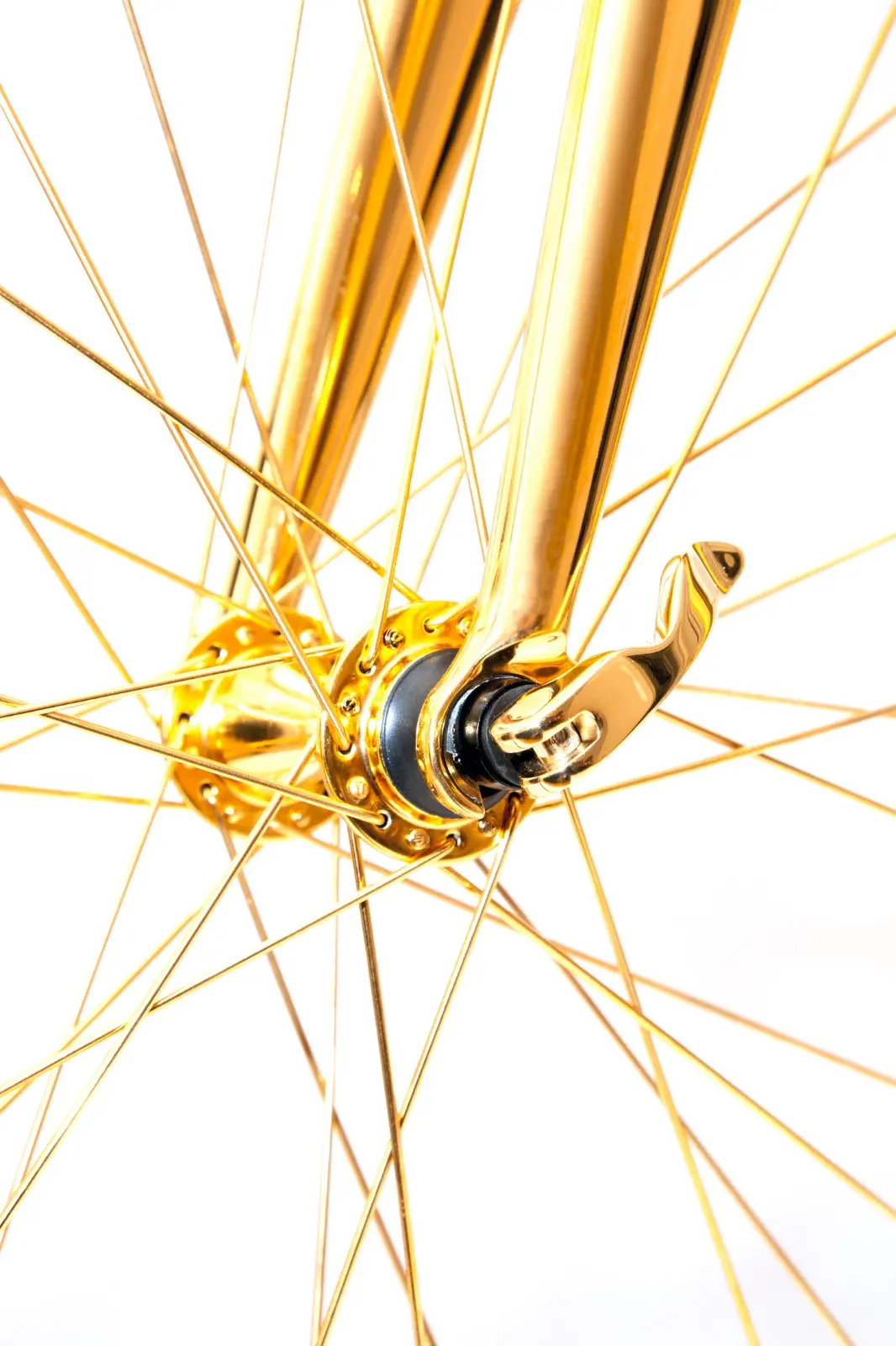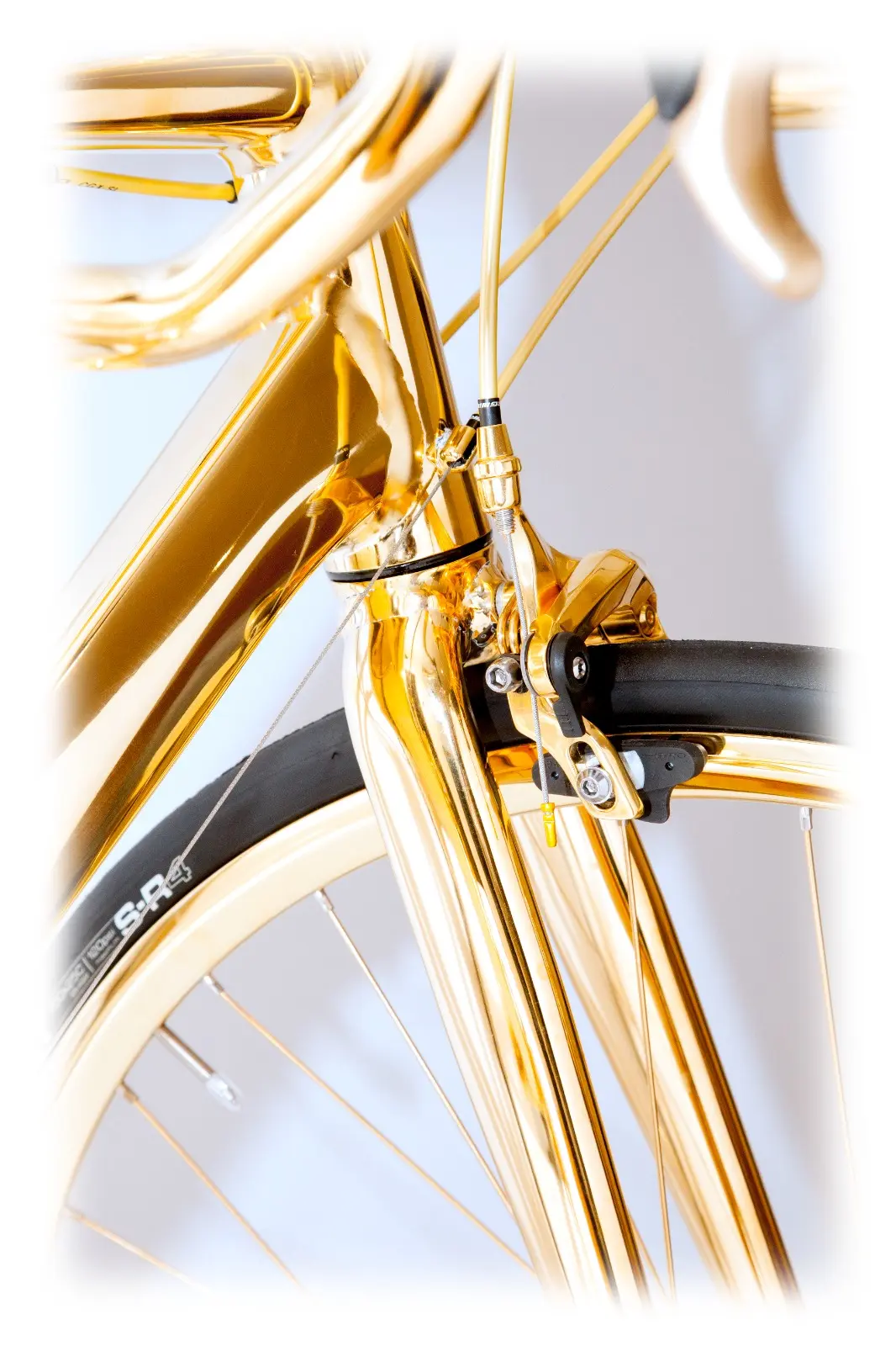 meticulously applied layer of deep Gold from the handlebars to every ridge of the gear chain, the bicycle boasts overtones of black accents in the soft suede saddle and the SR4 Tyres. Not only does the bicycle resemble a striking work of modern art to look at, but it is even more beautiful in motion, as sunlight bounces off the spinning spokes.