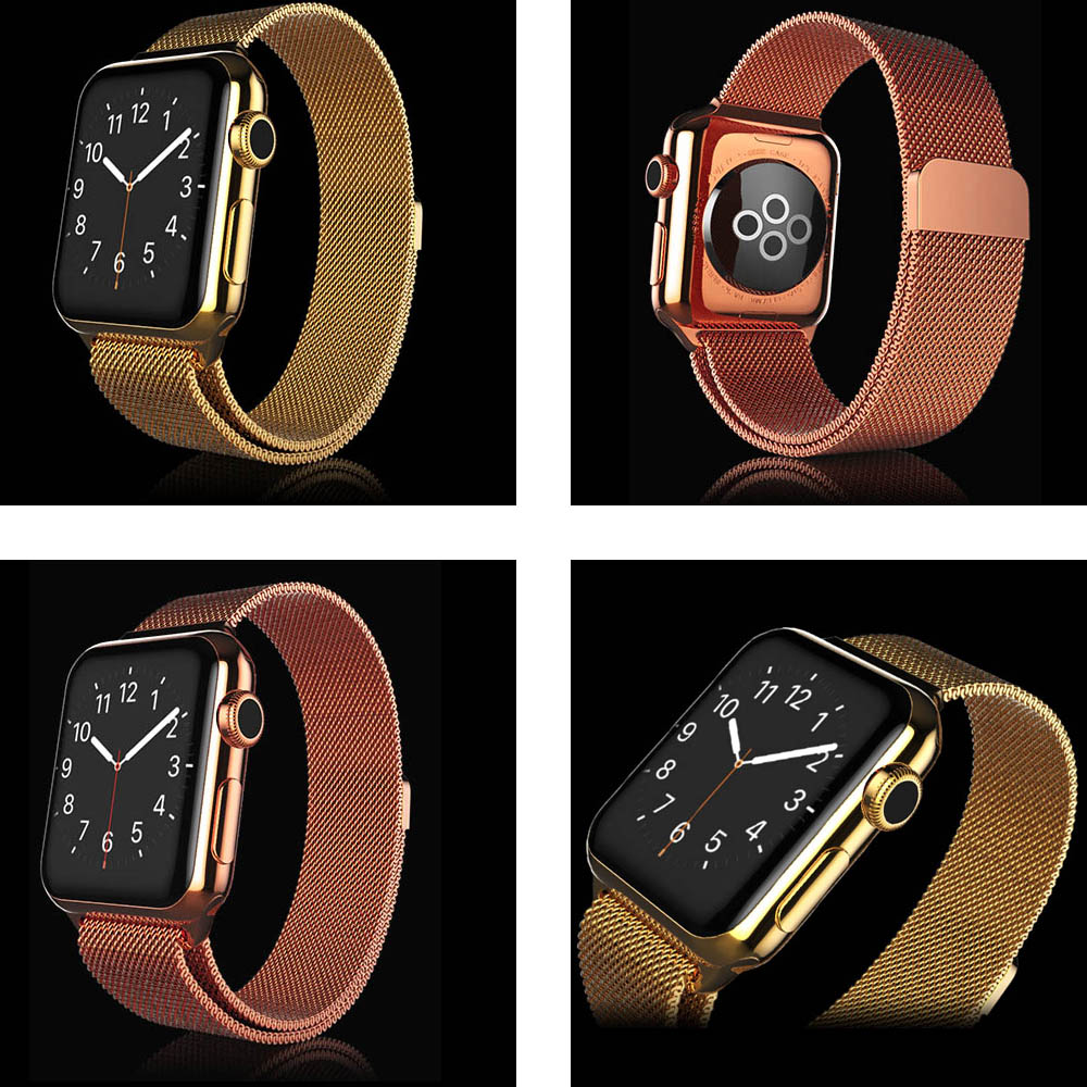 If you are a fan of Gold and the Milanese Apple Watch strap, you’re in luck! Due to high demand, our craftsmen have now added the 24k Gold customised Apple Watch with Milanese strap to the Apple Watch Spectrum Collection. The fine-knit Gold embellished lightweight stainless steel strap is absolutely beautiful and makes for a very elegant look.